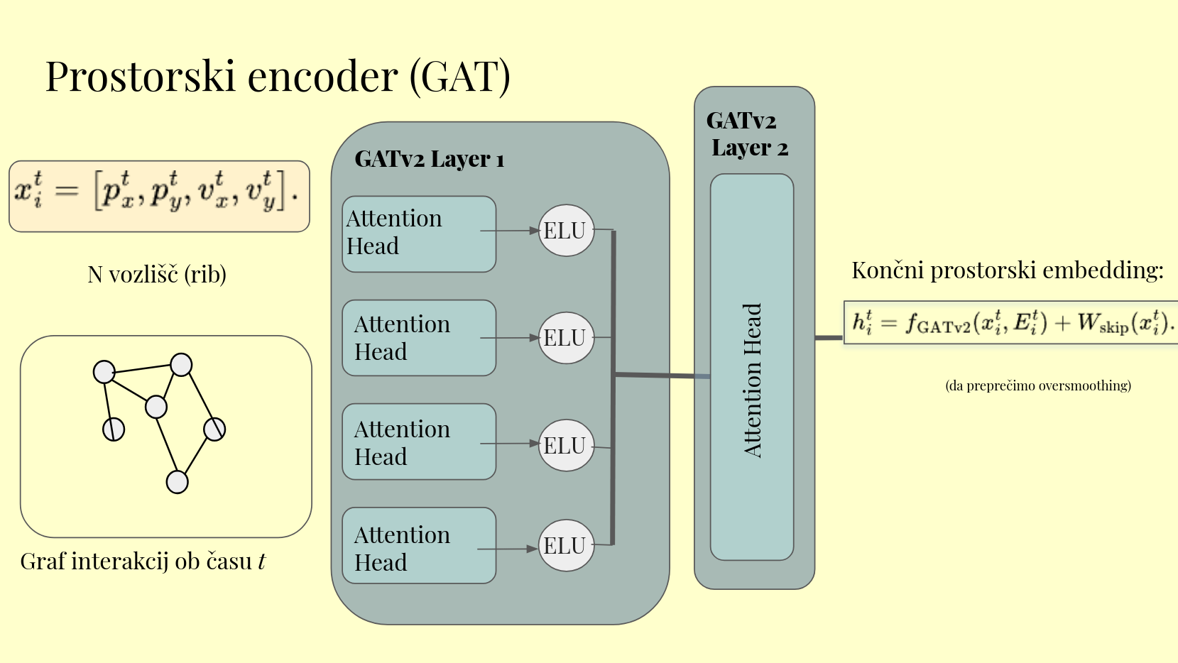 Osnovne GNN obravnavajo vse sosede enako, toda v jatah rib so bolj pomembne tiste, ki so tik zraven nas. Vpliv sosedov je torej odvisen od oddaljenosti, orientacije in hitrosti ribe. GAT (Graph Attention Network) reši ta problem, saj se za vhodna sporočila iz ostalih vozlišč priuči pomembnost uteži (attention coeficient). Mi ga izračunamo med pari vozlišč (rib) iz njihovih pozicij in hitrosti, ter ga normaliziramo po sosedih z uporabo softmaxa. S tem dosežemo, da ribe blizu skupaj in tiste, ki plavajo v podobno smer, bolj vplivajo druga na drugo. Formula kako posodobimo embedding $\mathbf{h}_v^{(l)}$ ribe $v$ na layerju $l$ znotraj GATa: $$\textbf{h}_v^{(l)}=\sigma \left( \sum_{u\in \text{sosedi}(v)} \alpha_{vu}\textbf{W}^{(l)}\textbf{h}_u^{(l-1)}\right)$$ Attention coefficient med vozliščema (ribama) $A$ in $B$ izračunamo kot $$e_{AB} = a\left( \textbf{W}^{(l)}\textbf{h}_A^{(l-1)}, \ \textbf{W}^{(l)}\textbf{h}_B^{(l-1)}\right)$$, kjer je $a$ neka točkovalna funkcija (ki se jo naučimo znotraj tega attention mehanizma).