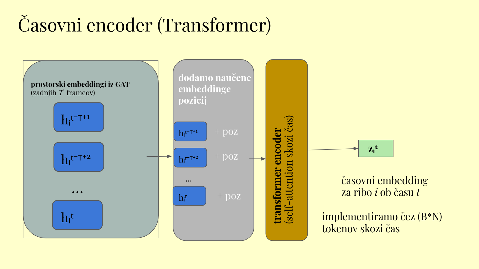 BONUS: Drugi del našega modela je transformer. Podobno kot transformerji gledajo npr zaporedje besed v povedi in poskušajo uganiti naslednjo, mi modeliramo odnose z zaporedjem. Pri tem uporabljamo self-attention mehanizem, pri čemer vsak element v zaporedju pogleda vse ostale in se nauči, kako pomembni so zanj (podobno kot se pri stavku nauči, na katero besedo se npr nanaša nek zaimek ali pridevnik). Temporal (časovni) transformer obravnava zaporedne time frame (časovne korake) kot zaporedje, kar omogoča našemu modelu da se nauči, kako prejšnja stanja jate rib vplivajo na prihodnje obnašanje.