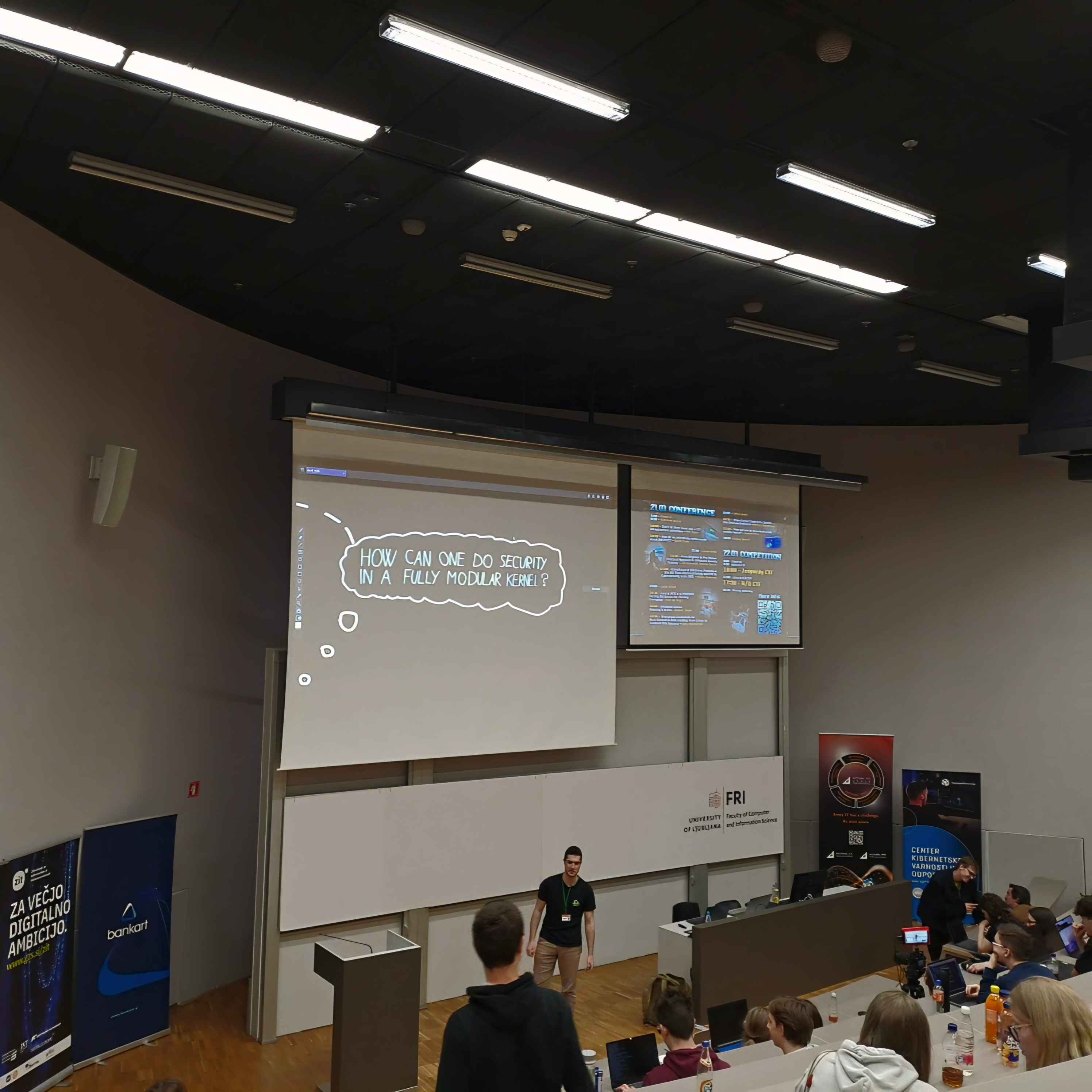 S programerskim klubom smo se udeležili dvodnevne cybersecurity konference, ki je potekala 21. in 22. marca na FRI. Prvi dan smo poslušali ogromno zanimivih predavanj, najbolj pozitivno me je presenetila tista, ki je na začetku zvenela najbolj dolgočasno - "Compliance of electronic products in the EU". Tip iz FE je v resnici govoril o tem, kateri varnostni elementi manjkajo izdelkom, ki jih kupiš na Aliexpressu in kako to pomeni, da bodo prej ali slej eksplodirali. Še eno kulsko predavanje je o vdiranju v stare računalniške igre.