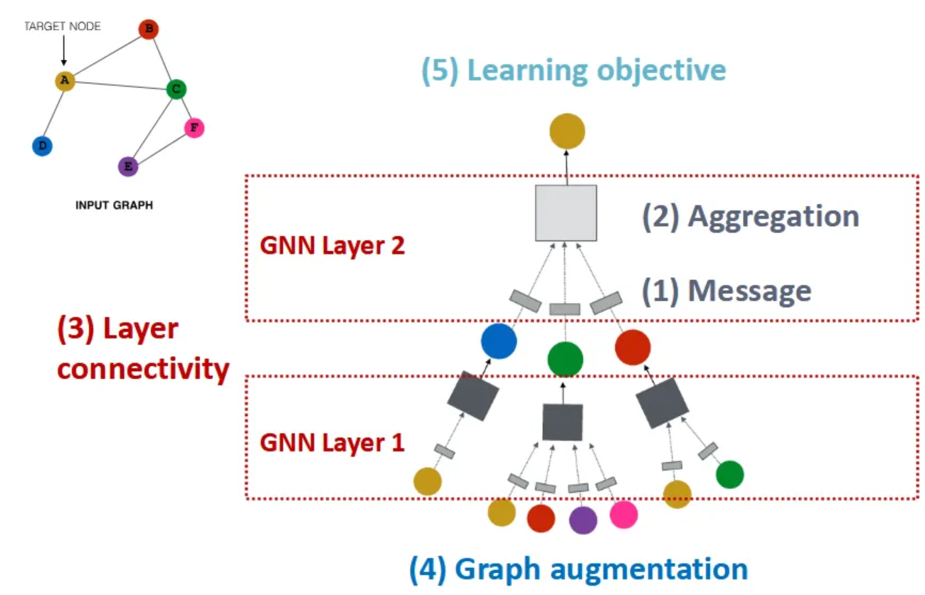 Pogosto podatkov nimamo v urejeni obliki kot je mreža (slike) ali pa zaporedje (tekst). Reprezentacijo vozlišč se priučimo z iterativno agragacijo okolice, pri čemer vsako vozlišče posodobi svoj embedding glede na trenutni embedding & embeddinge vozlišč v neki okolici. To, da pri izračunu uporabimo samo okolico vozlišča pomeni, da so GNN invariantne za permutacije vozlišč ter nam omogoča delo z variabilnimi velikostmi jat. To lahko zašišemo v matrični formuli z dvema "trainable" linearnima transformacijama $W^{(l)}$ in $B^{(l)}$: $$\mathbf{h}_v^{(0)} = x_v$$ $$\mathbf{h}_v^{(l+1)} = \sigma \left( \mathbf{W}^{(l)} \sum_{u \in \text{sosedi}(v)} \frac{\mathbf{h}_u^{(l)}}{|\text{sosedi}(v)|} + \mathbf{B}^{(l)}\mathbf{h}^{(l)}_v \right), \quad \forall k \in \{0, \dots , K-1 \}$$ $$\mathbf{z}_v = \mathbf{h}_v^{(K)}$$